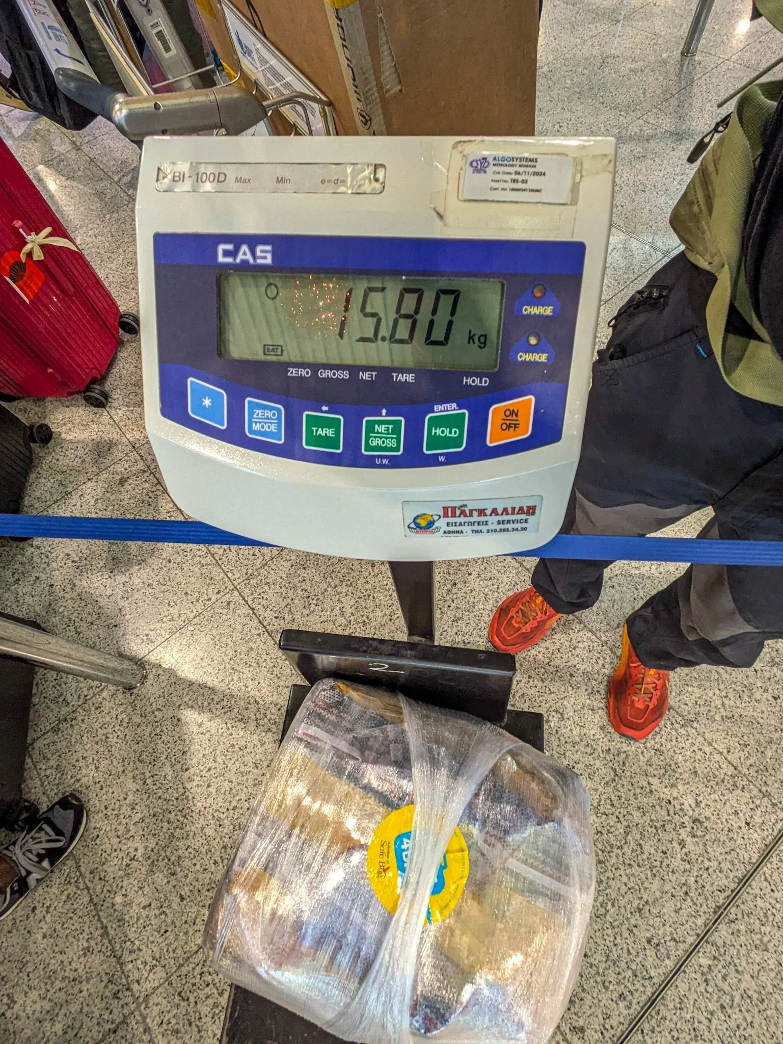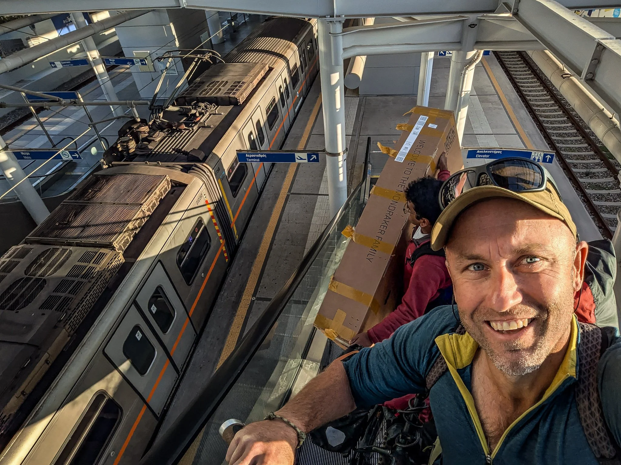 Athens, and the logistics of taking a bicycle and box to the airport. A taxi would have been the easiest way, but I’d made it into Athens two months prior to this by unboxing my bicycle at the airport, then transporting it into the city by train, alongside the empty box I wanted to retain (easier than lifting a box carrying a bicycle!). A €30-40 saving, so here I was doing it in return, aided by someone who was staying at the same hostel as me and also headed to the airport. When he offered to help lift the empty box on and off the train, while I wheeled my loaded bicycle, I was quick to say yes! I gave myself plenty of time before check-in to then box the bicycle at the airport.