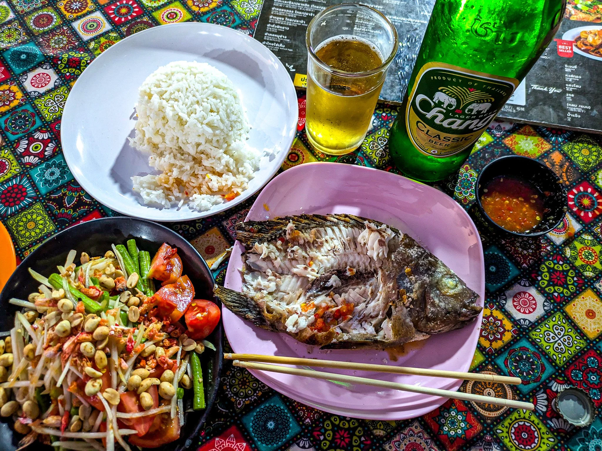 Dinner beside the Mekong in Chiang Saen. The cost of eating out here is a fraction of what it costs in the UK.