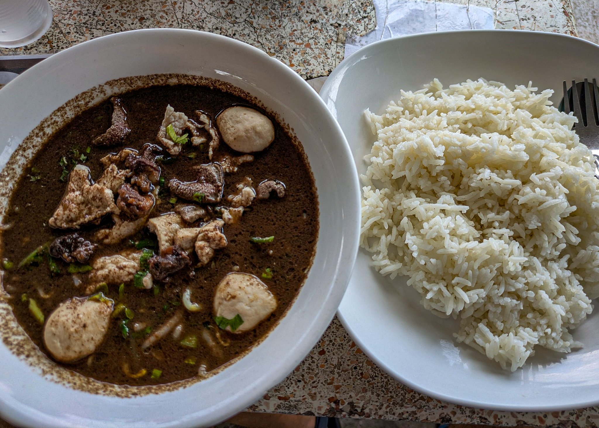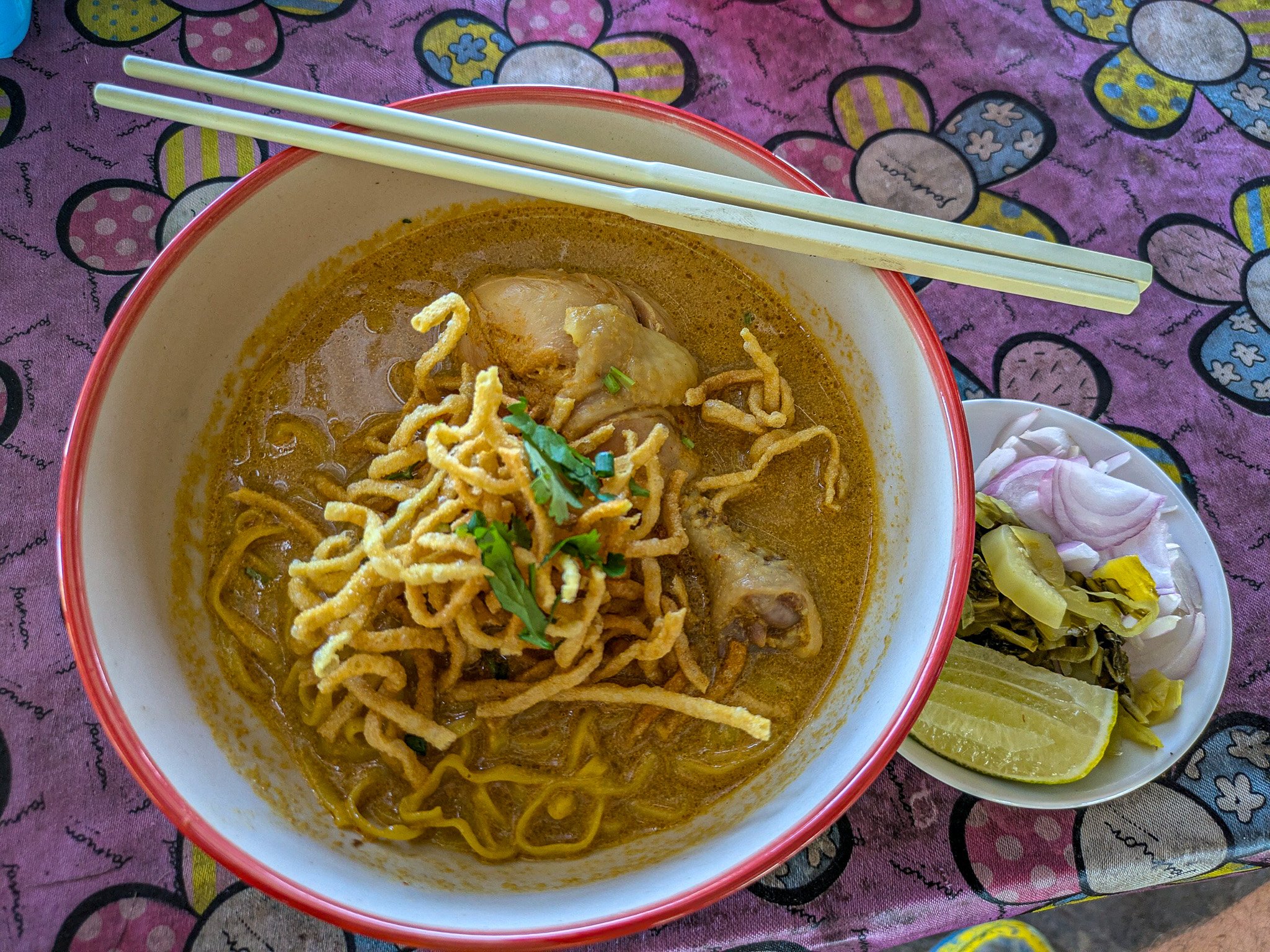 Now that I was in Northern Thailand I noticed some differences in the food. Khao Soi is a popular coconut-based chicken noodle soup in a curry-flavoured broth, served with lime and onion on the side. Price around £1.50.