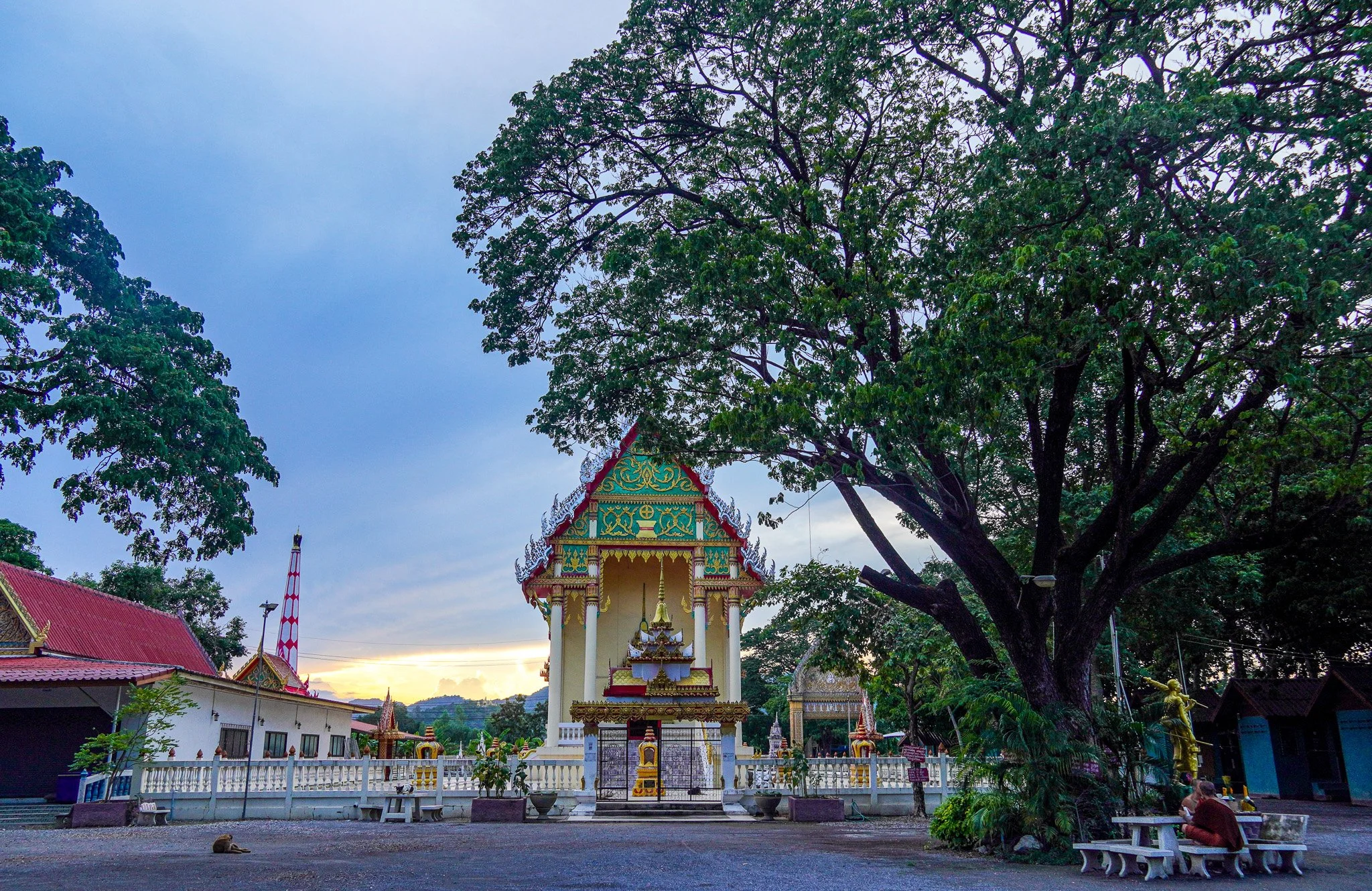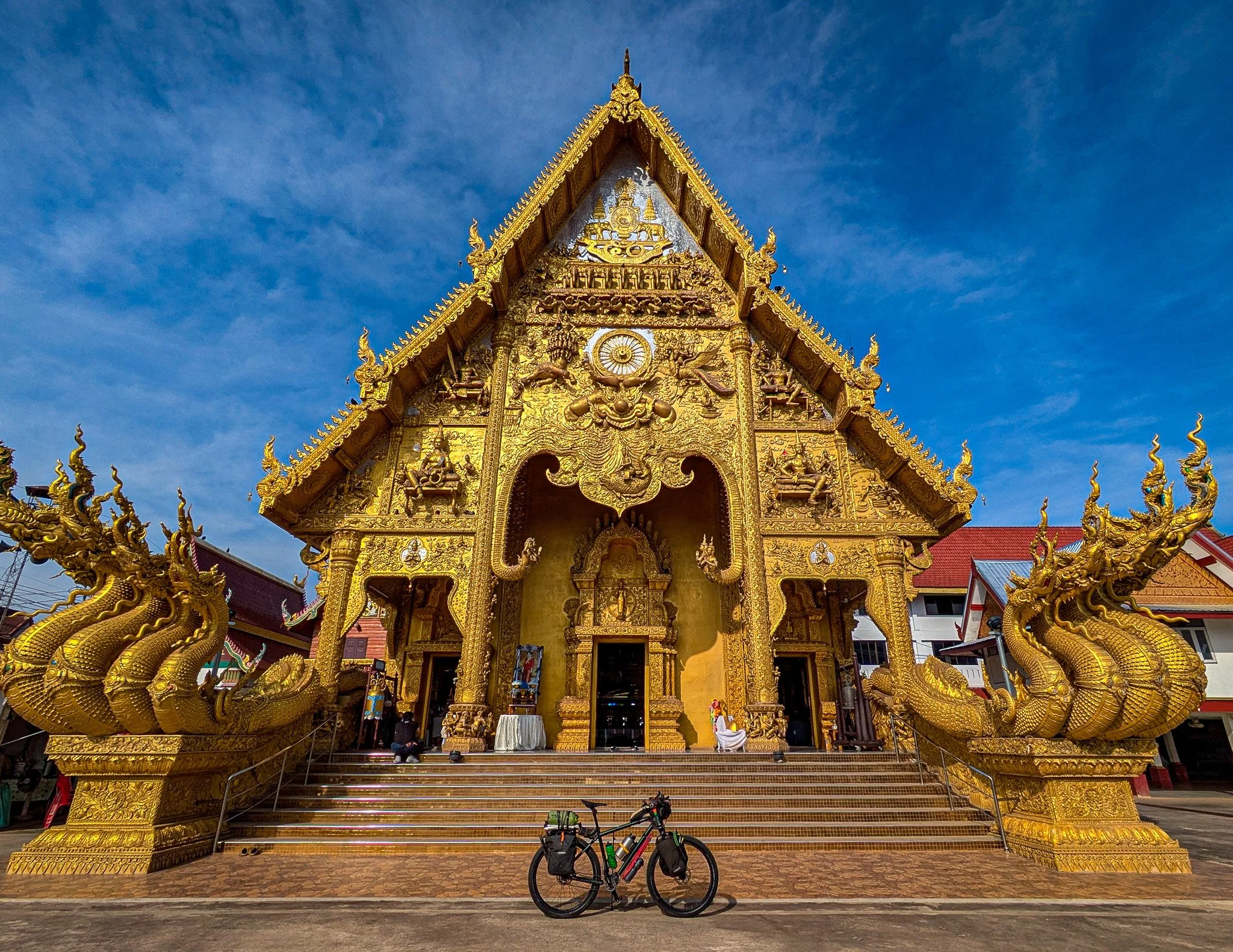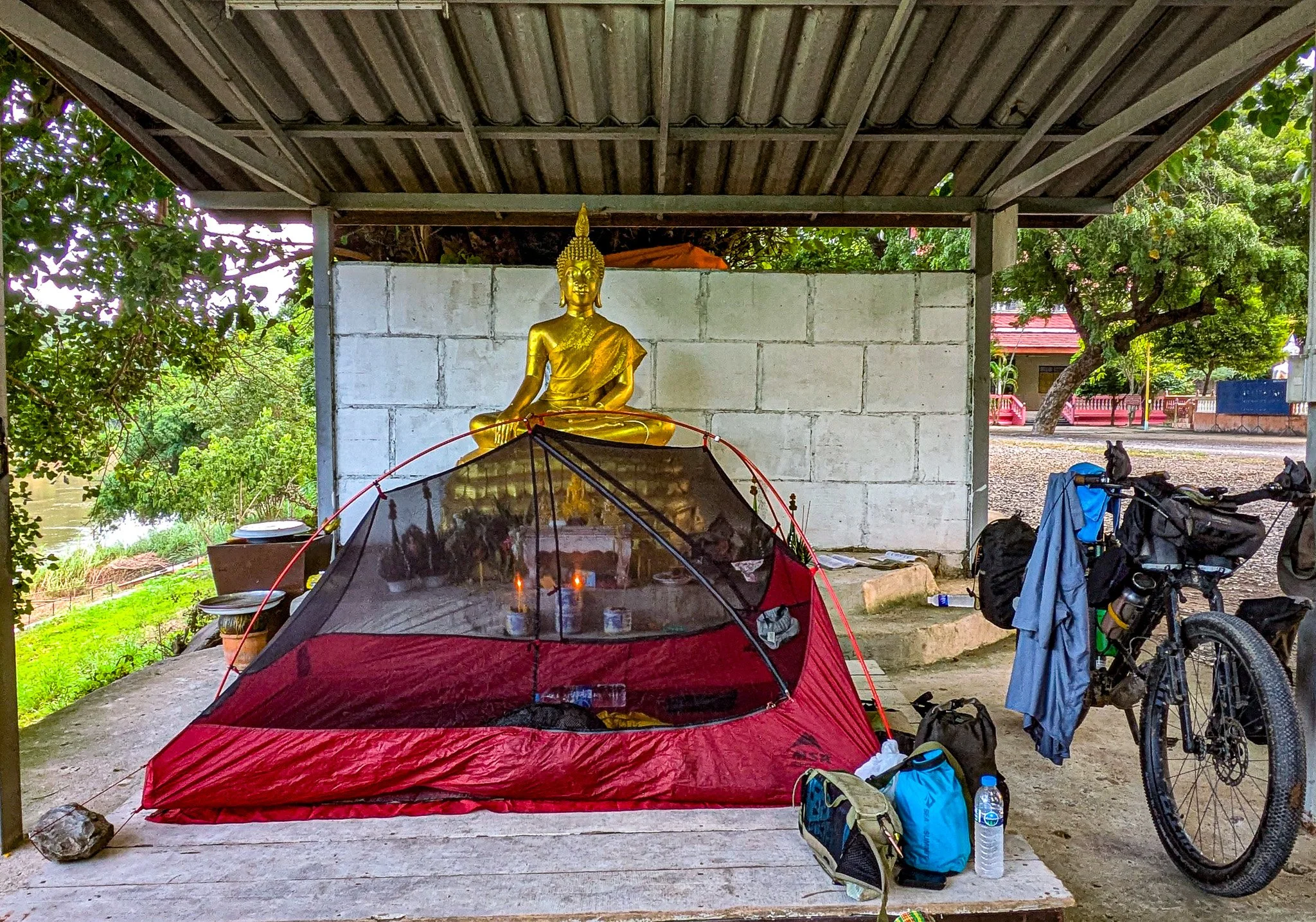 The end of Day 2 took me to a large temple on the edge of a village. I had read about cyclists camping in temples before, but had never done this on my previous trip to Thailand. I think I felt that Buddhist temples were sacred spaces only reserved for practicing Buddhists, which is totally wrong. So as the light was fading and I had made no other booking or plan for where to sleep, I rode into the temple grounds and identified a spot that would be ideal to pitch my tent.