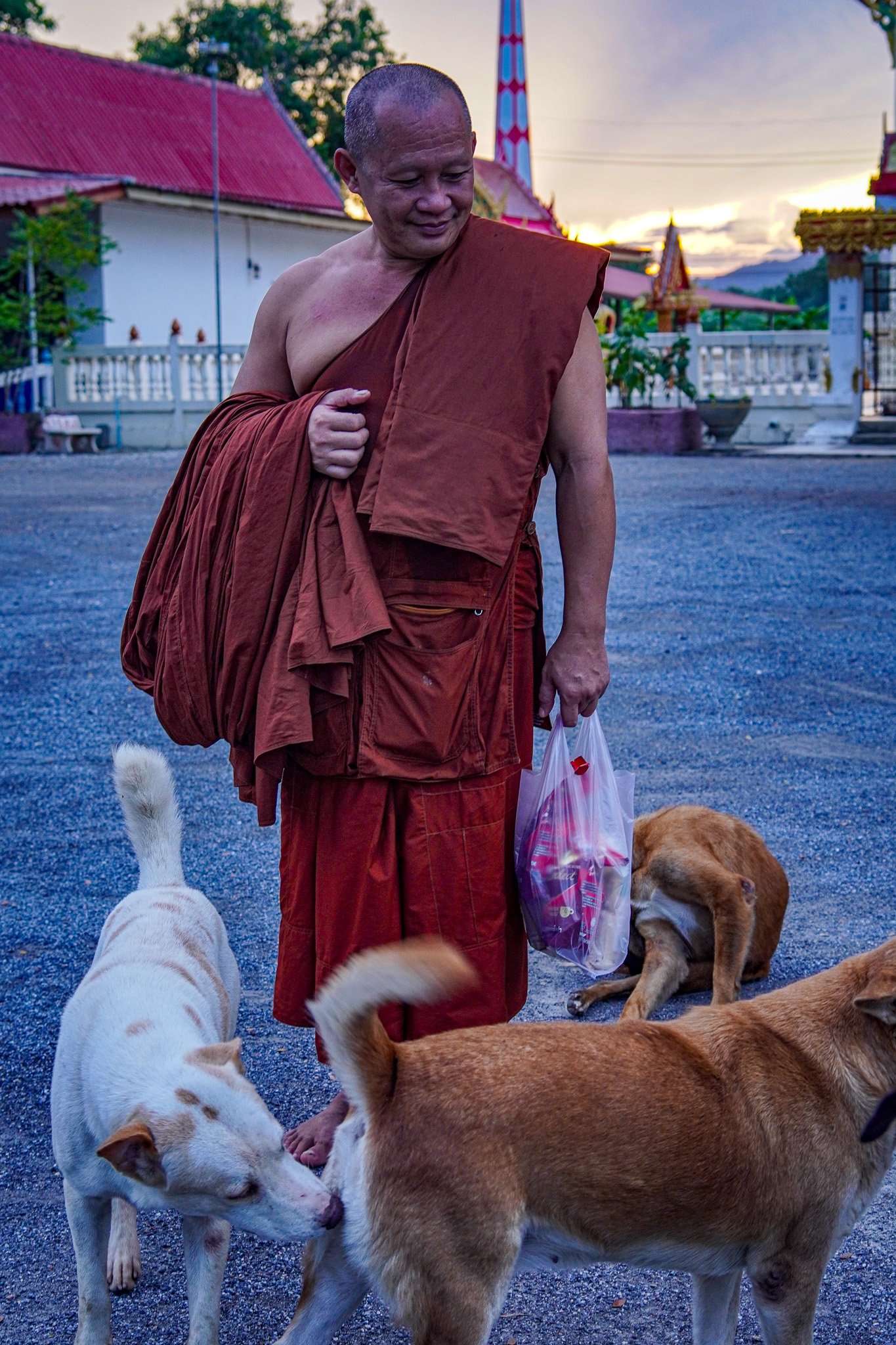 Thai temples are often home to numerous dogs, which are fed by monks and have a better life than they would roaming the streets. An elderly monk had seen me arrive and smiled. I then went to greet him and ask permission to camp. The toilets and shower block were pointed out to me. Once the dogs had got used to my presence they settled down and I pitched my tent.