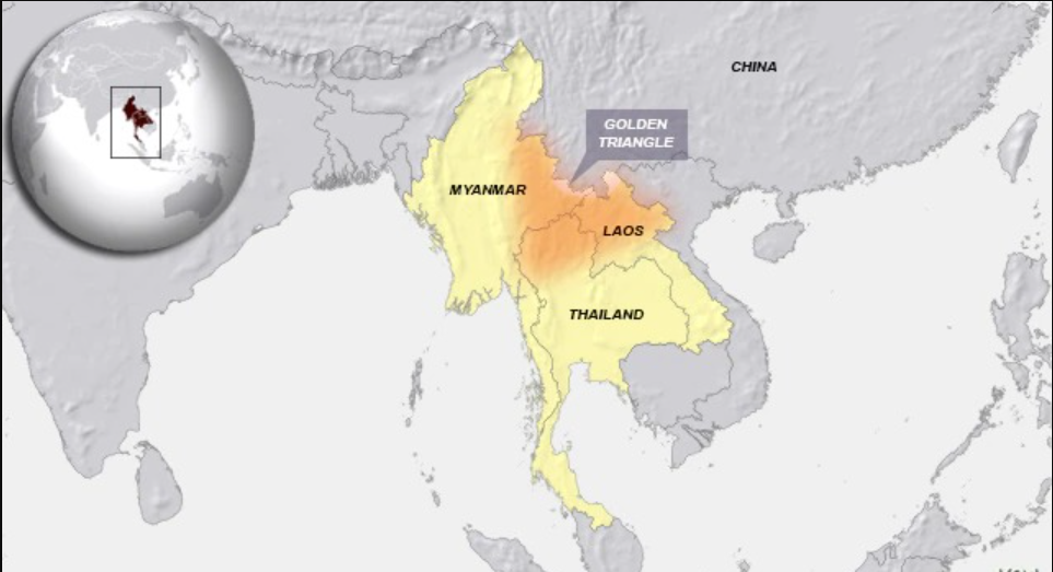 The Golden triangle refers to this mountainous area of land shared by Myanmar, Laos and Thailand. While opium production is now minimal in Thailand and Laos, it has increased in recent years in Myanmar.