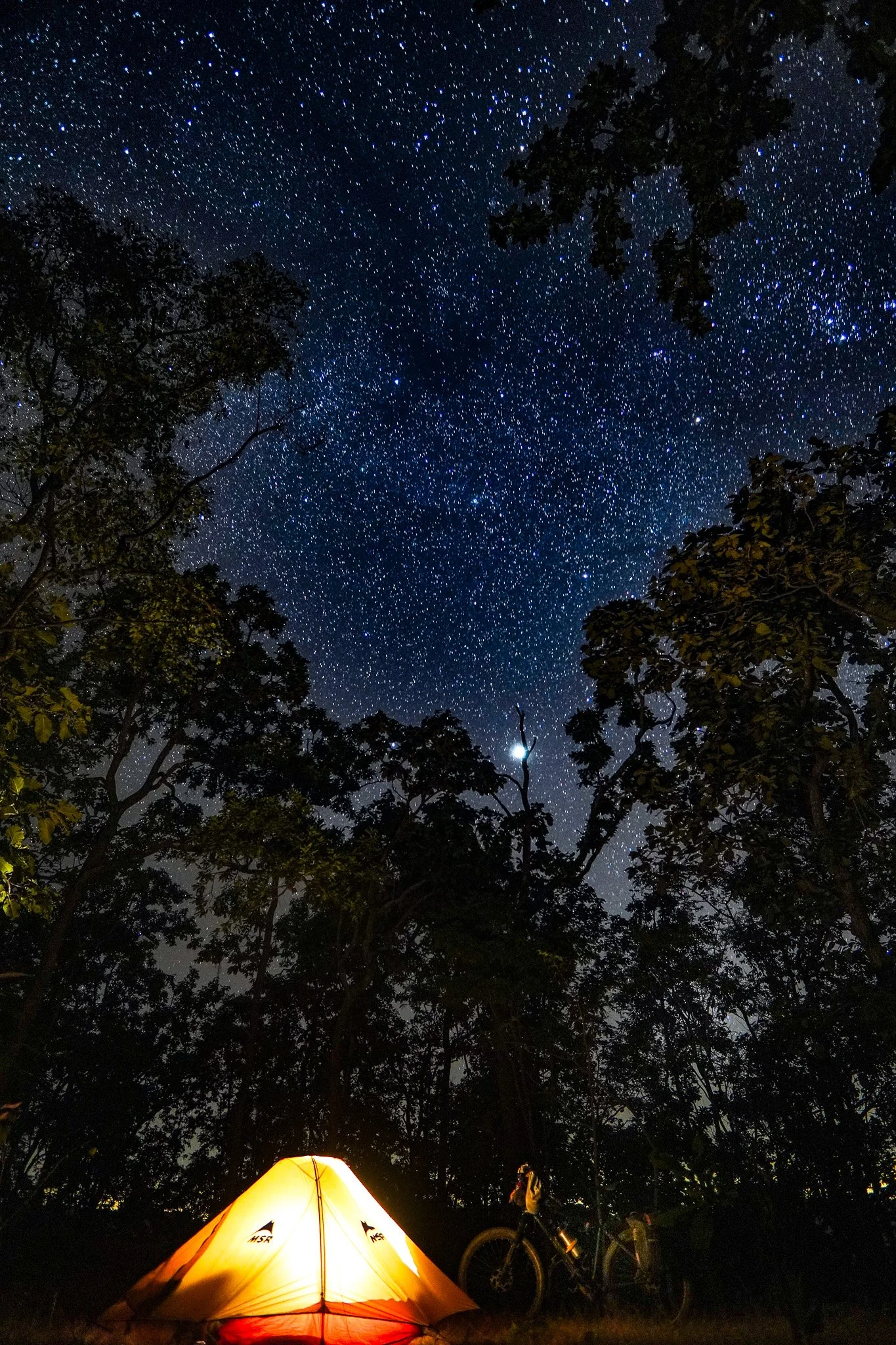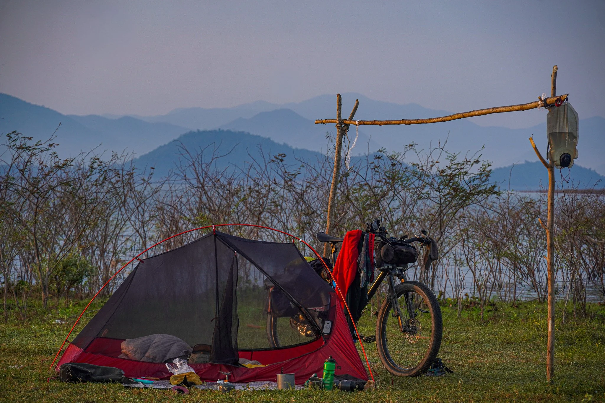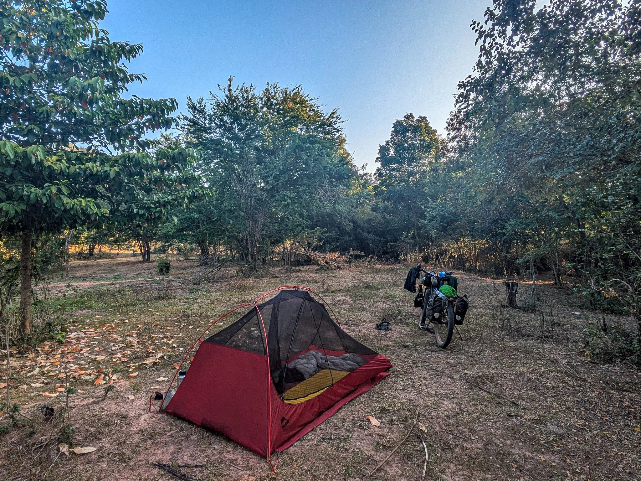 Back in the tent. A clear night in the forested hills between Mae Sot and the town of Tak, where I was headed. While camping wild in some of these wooded areas was peaceful, on several occasions in Thailand I realised (usually later in the night, such as on this occasion) that my tent was pitched close to termites. When hundreds/thousands of termites start moving under a tent, it creates a lot of vibration and heat. Without moving the tent I could easily imagine the groundsheet and tent floor being eaten through.