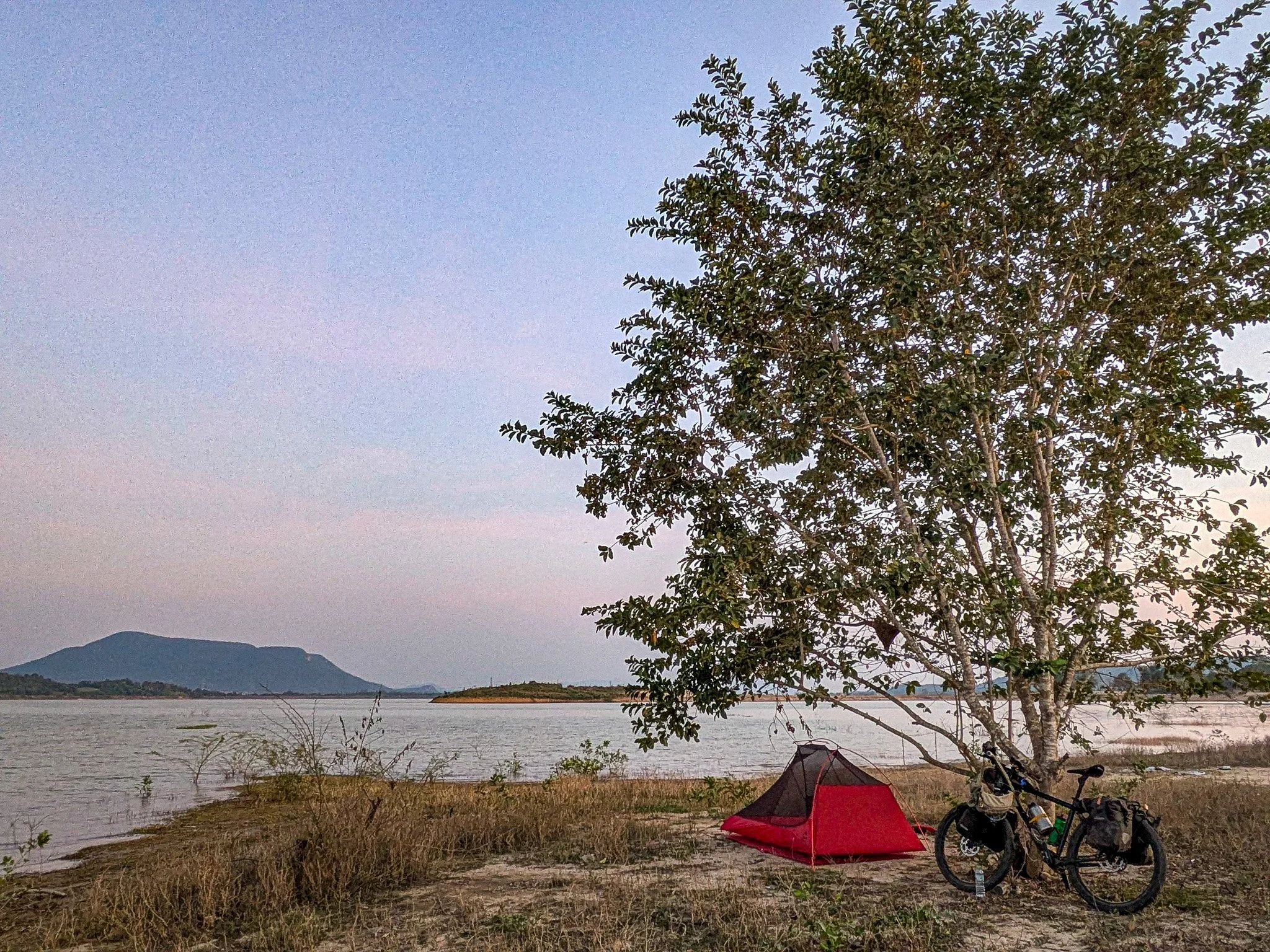 With higher temperatures, it’s fortunate that there were some lakes en—route. This one, Khlong Dam, was the first of several I camped beside.