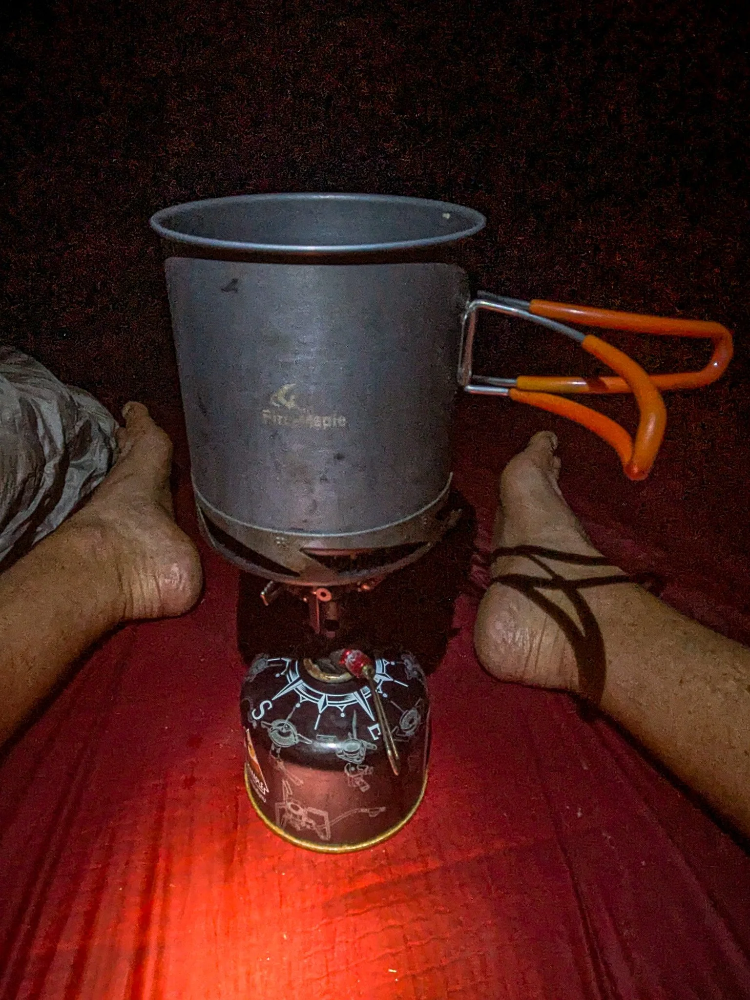 Cooking in the tent. Mosquitoes were often out in force after sunset. The advantage of using a small gas stove and pot is that I could cook inside the tent, away from getting bitten. My evening meals when camping in Thailand didn’t extend much beyond packet noodles, mixed with some tinned fish or eggs.