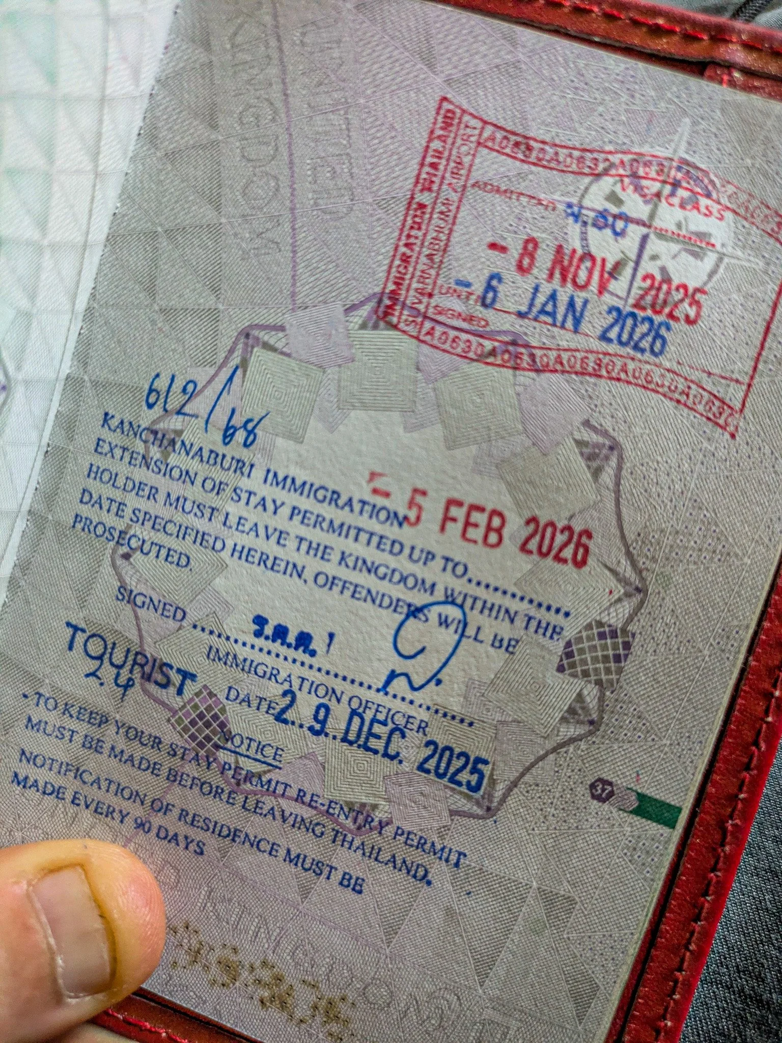 Visa extension done. On arrival in Thailand I received a 60-day free stay. Initially I thought this would be sufficient for my time in Thailand, but soon realised I would need an extension. A 30-day extension was provided with a trip to the immigration office in Kanchanaburi, where proof of onward travel was necessary (I already had a flight booked out of Malaysia) as well as a1900 baht (£45) fee for the extension.