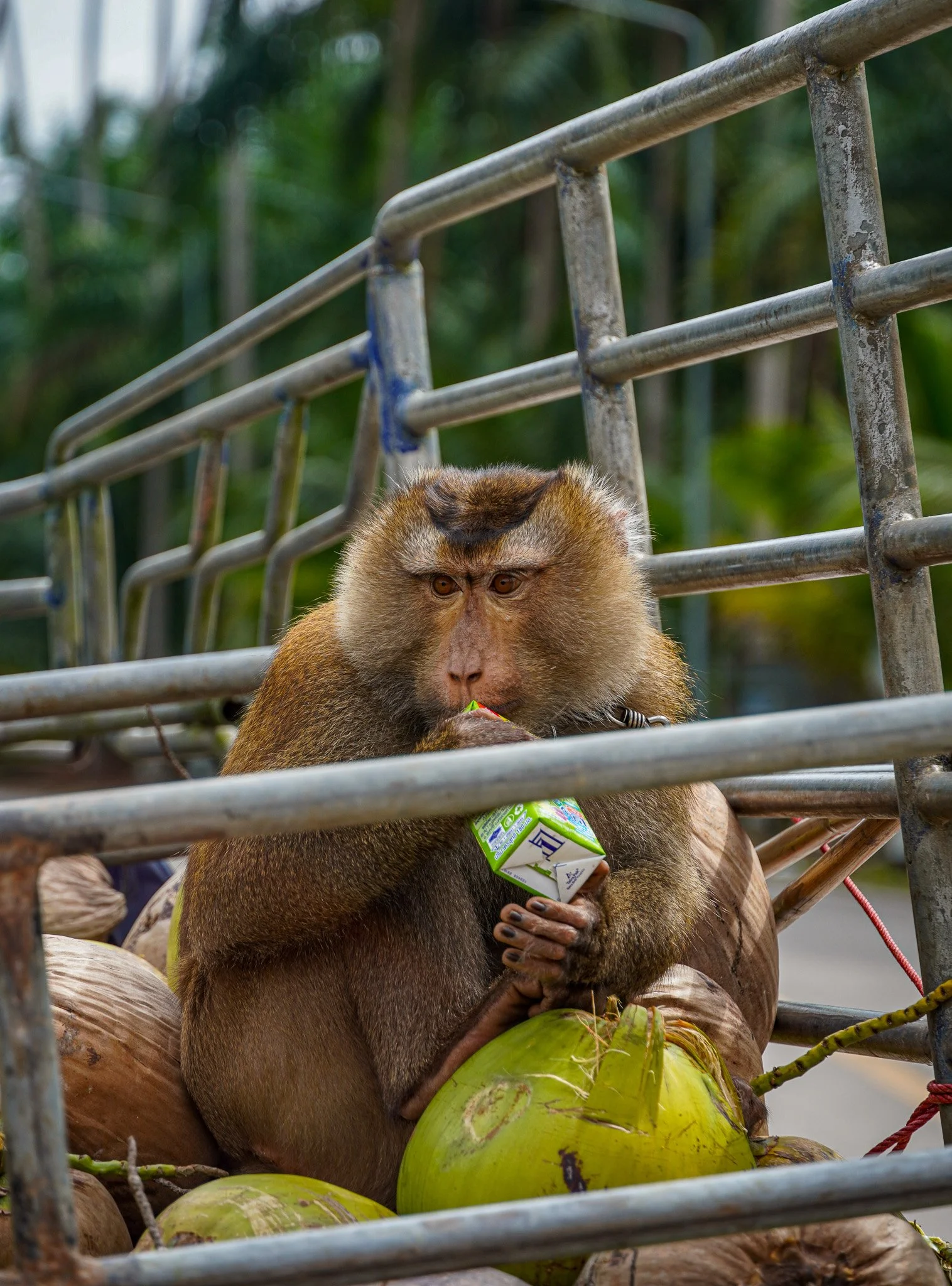A drink break. In Thailand, monkeys have long been trained to harvest coconuts. Though the practice is declining and increasingly criticised, I still saw pickups carrying coconuts—and the occasional chained monkey, like this one.